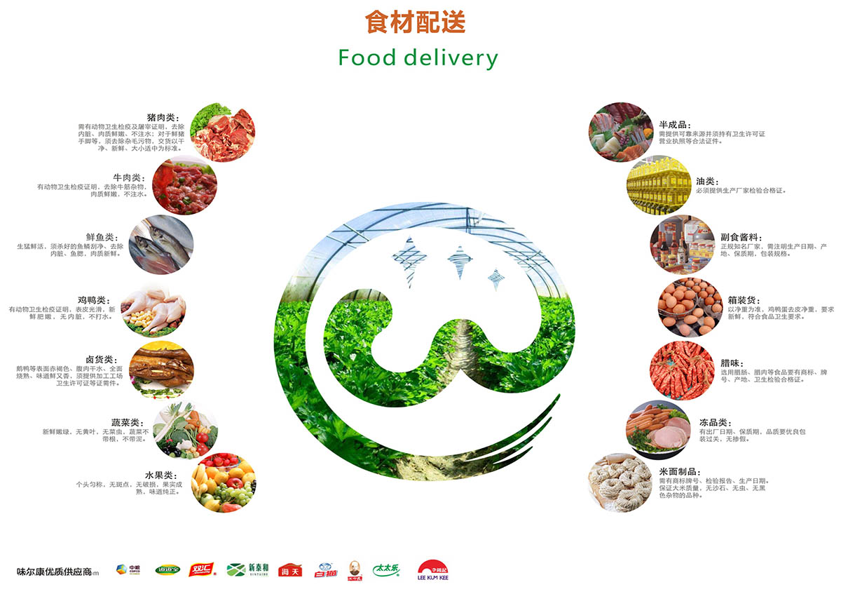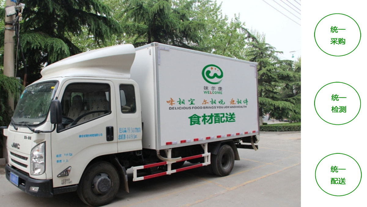 食材配送是味爾康服務項目之一,公司以“味相宜、爾相悅、康相伴”為企業使命,踐行“綠色、環保、新鮮、健康”為經營理念,經過多年的發展及完善,積累了豐富的配送經驗和完整配送、采購、檢測體系。